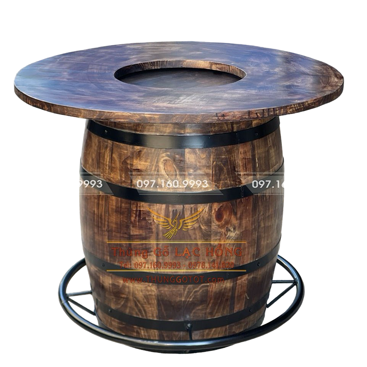 Kiểu dáng: Phần thân vẫn là chiếc thùng rượu gỗ như mọi mẫu khác nhưng ở phần chân thùng được lắp thêm vòng sắt để khách hàng ngồi có thể gác chân lên giúp người ngồi lâu không bị mỏi chân do ngồi ghế cao. Phần mặt bàn phía trên là mặt tròn đường kính 100cm khoét thủng phía giữa. Phần giữa đó sẽ thông xuống bên mặt dưới của thùng gỗ tạo thành mặt thấp hơn 6cm so với mặt bàn to. Phần thấp này sẽ phù hợp để một bếp lẩu, bếp nướng hoặc để các đồ dùng chung cho khách như chai rượu, tháp bia…